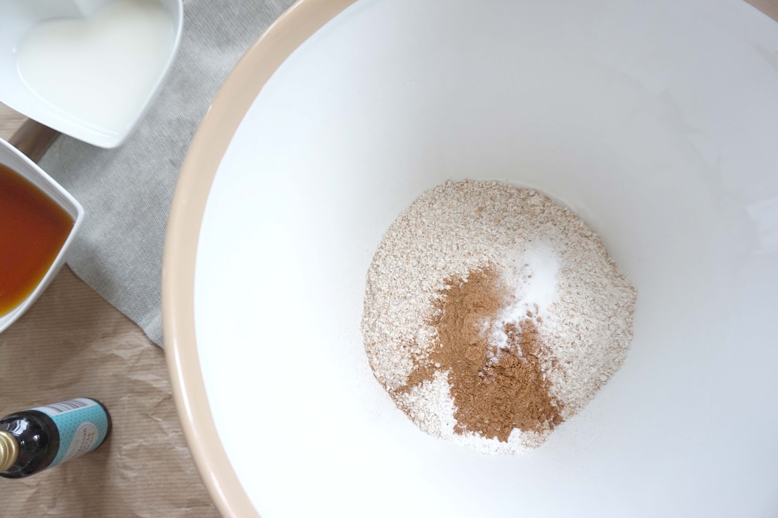2. Mix together the dry ingredients in a small bowl (flour, baking powder, baking soda, cinnamon, nutmeg and salt) and put this to one side.