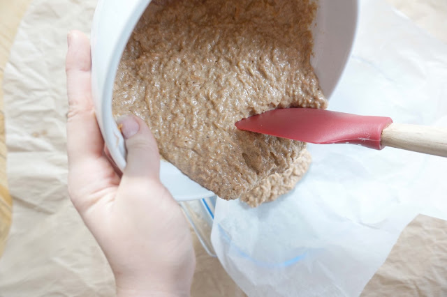 6. Pour the carrot cake mixture into the pre heated pan and spread evenly across.